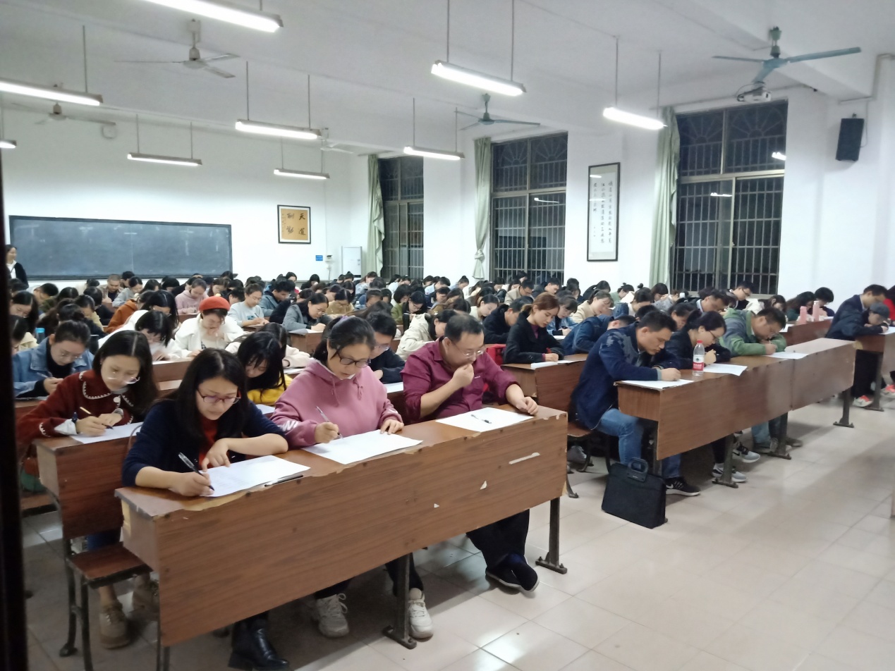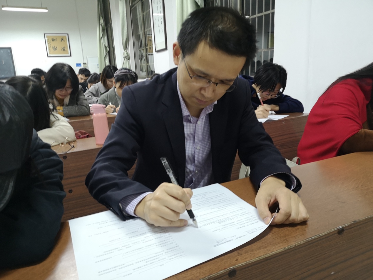 为深入学习贯彻习近平新时代中国特色社会主义思想,检验学习效果,真正达到理论学习有收获的目标,进一步推动主题教育深入开展,2019年11月13日晚7点,学院在文渊楼316教室举行“不忘初心、牢记使命”主题教育理论知识竞赛,院党委办主任夏云飞、院学工办主任周灿担任监考,院党委书记李伶俐、副书记熊剑峰到场巡考。