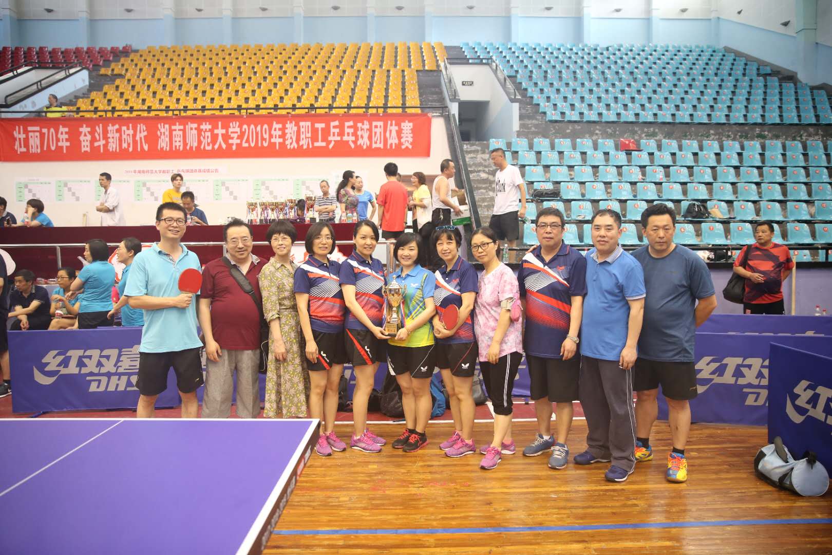 (通讯员 王婧之)6月14日至15日,2019年度湖南师范大学职工乒乓球团体赛在校体育馆举行。我院乒乓球运动队12名队员经过两天奋力拼搏,取得了团体赛第七名的好成绩。院党委书记李伶俐、院工会主席徐朝红、赵树勤等老师到场为运动健儿鼓劲加油。