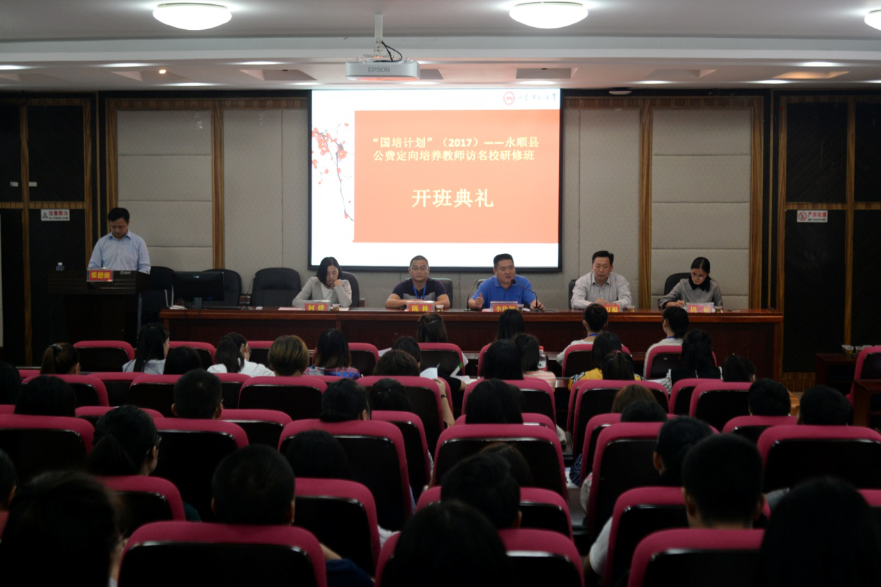 (通讯员:包佳文)2017年10月10日上午,国培计划(2017)——永顺县公费定向培养教师访名校研修班在文学院216报告厅开班。文学院党委书记李伶俐,副院长彭万福、副教授周敏以及培训班管理班主任何烨等出席开班典礼。开班典礼由文学院成教办主任张德强主持。