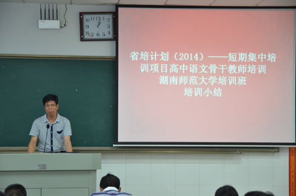 (记者刘雨溪)万里无云,暑气未退,相聚总是短暂。8月29日上午,省培计划(2014)——短期集中培训项目高中语文骨干教师培训湖南师范大学培训班来到离别时刻。湖南师范大学文学院教授、项目首席专家张良田,文学院成教办主任彭万福,学工办主任夏云飞,副教授李霞,团委副书记周灿以及省培全体学员出席结课典礼。学员张世程担任主持。