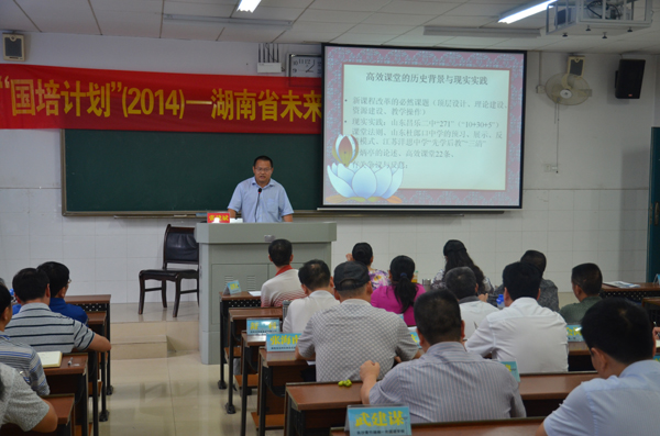 (通讯员张依倩)8月20日下午,长沙外国语学校校长、硕士生导师、语文特级教师张建斌为“国培计划(2014)”未来教育家高端项目培养项目研修班全体学员做了一场精彩的专题讲座。讲座主题为《高效课堂三三制》。