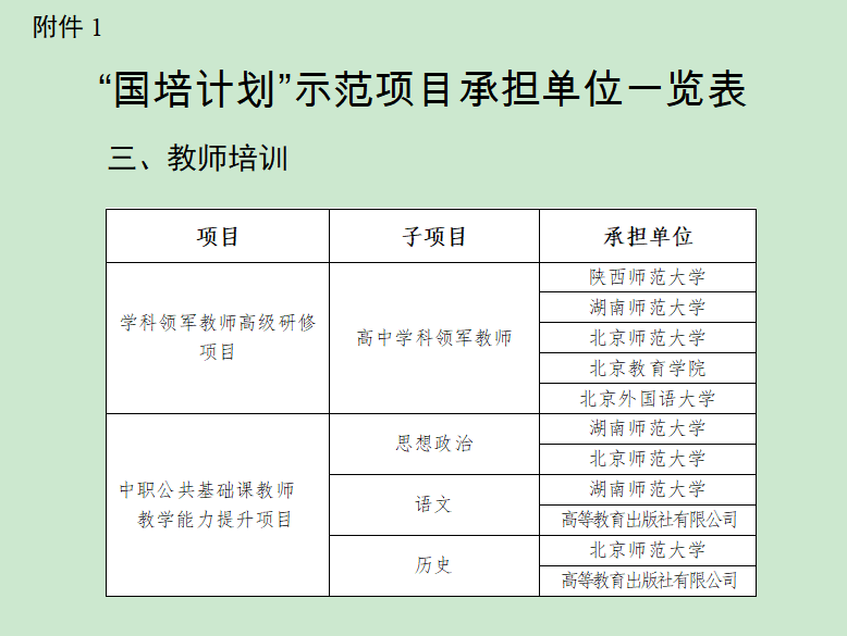 2022年“国培计划”示范项目设置四大类:1、培训团队研修,经评审,确定北京教育学院等8家单位承担培训任务;2、校园长培训,继续支持国家教育行政学院等19家单位承担中小学幼儿园骨干校园长高级研修、优秀校园长高级研究和中小学幼儿园党组织书记示范培训等5个项目;3、教师培训,经评审,确定湖南师范大学,北京师范大学等26家单位承担培训任务,主要设置学科领军教师高级研修、紧缺薄弱领域骨干教师示范培训2个项目;综合改革项目确定陕西师范大学等22家单位承担培训任务。