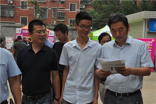 下午,周俊武副校长协同我校学工部何旭娟部长,以及校学生工作部网络教育办公室主任陈丽荣等领导抵达张公岭校区。看到迎新的学生工作人员,周俊武亲切示意同学们无须紧张,平常对待,并给予学生工作人员赞扬。周俊武向熊剑峰等人询问了接下来的日常流程,查看下午在图书馆即将召开的家长会现场,了解到招生报道情况。15级辅导员陈胜冲将文学院新生特刊《号角》予周俊武等人过目。