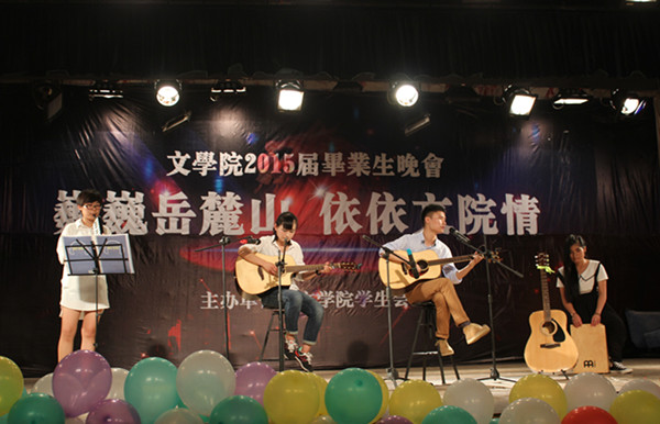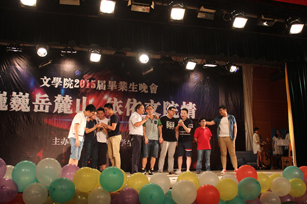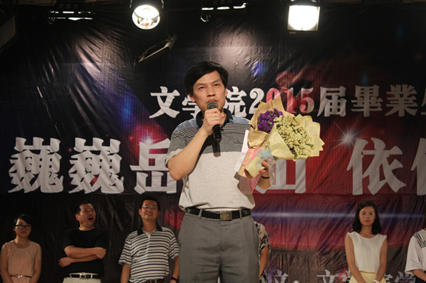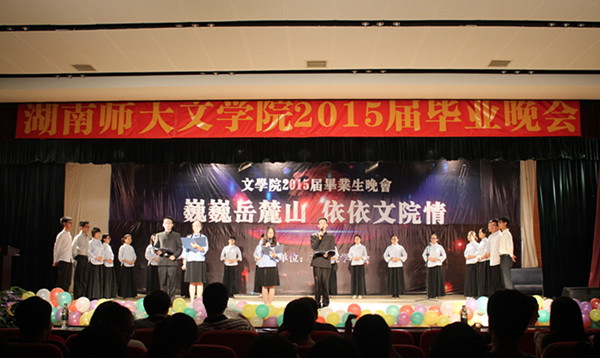 (通讯员唐洁黄珺俐)巍巍岳麓山,依依文院情。6月16日晚,由文学院学生会主办的2015届毕业晚会在江边活动中心举行。文学院党委副书记熊剑峰、文学院副院长岳凯华、学工办主任兼11级辅导员夏云飞、院团委书记张小春、2013级辅导员熊陶庆子、2014级辅导员周灿等学院领导老师出席晚会。