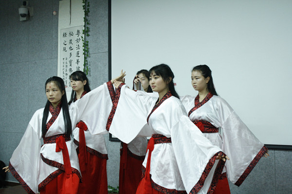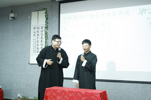 (湖南师范大学新闻网通讯员 谢吴越 张倩)5月20日晚,由湖南广播电视台茶频道、文学院团委主办,文学院鹿鸣茶艺社承办的“我知茶,我知爱——爱茶,爱人,爱人生”的520茶会活动在文学院217教室举行。在中南大学笛子协会王文熙演奏的悠悠古筝曲《渔舟唱晚》中,茶会表演正式开始。鹿鸣茶艺社成员带来暖场幽默相声《我请你喝茶》,引来现场观众一致叫 好。伴随着古琴曲响起,两位身着典雅衣裳的茶艺社成员走上表演台。一提、一托、一到、一点,再将盛在茶具中浸泡过的茶叶翻向观众,茶艺社成员素手执碗,只 为闻香。清水打旋倒入杯中,再经过温杯、去沫一系列调理,一壶清茶泡好。等候在旁的礼仪成员向嘉宾施以茶道特有的手法,将茶分杯端入会场,配上现场摆放的 茶点,可谓是“古色古香”。