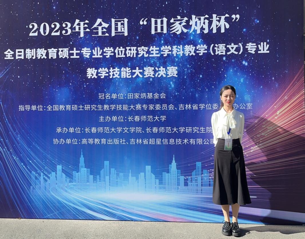 (通讯员蒋晓兰)10月15日,2023年全国“田家炳杯”全日制教育硕士专业学位研究生学科教学(语文)专业教学技能大赛决赛在长春师范大学圆满落幕,我校2022级学科教学(语文)研究生脱颖而出,成绩名列全国高校前茅,蒋晓兰荣获一等奖,杨珍荣获二等奖,刘光成荣获优秀指导教师奖。这是我校学科教学(语文)研究生在全国赛事中取得的又一次荣誉。