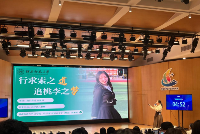 陈雅欣将高中语文教师定为她的职业规划目标。经过多次赛事的严格训练和专家的精心指导,她对这一职业目标进行了深入细致的分析,并制定了全面的行动计划。在决赛中,她向评委们展示了自己在职业规划中的奋斗历程和成长故事,赢得了评委们的一致好评。在问答环节,陈雅欣对评委的随机提问应对自如,充分展现了文学院学生卓越的口语表达能力和应变能力。