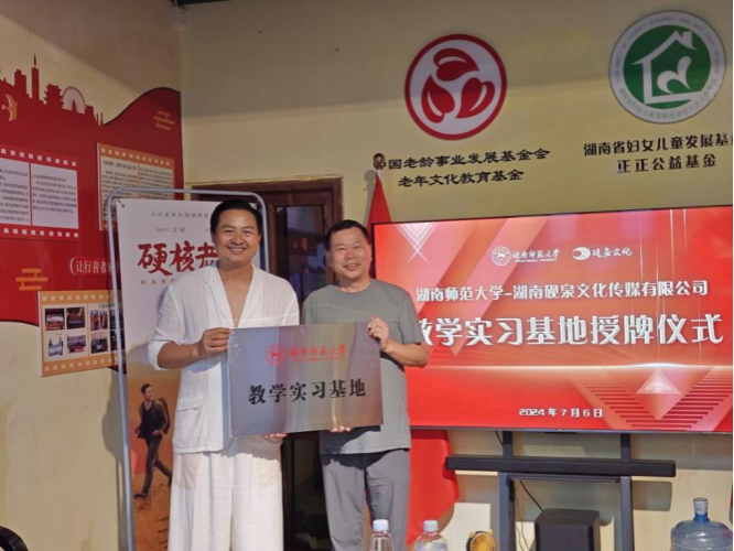 7月6日下午,湖南师范大学教学实习基地授牌仪式在湖南砚泉文化传媒有限公司举行。湖南师范大学文学院教学副院长、教授、博士生导师岳凯华向湖南砚泉文化传媒有限公司董事长文祥授牌,标志着湖南砚泉文化传媒有限公司正式成为湖南师范大学戏剧影视文学专业实习基地。