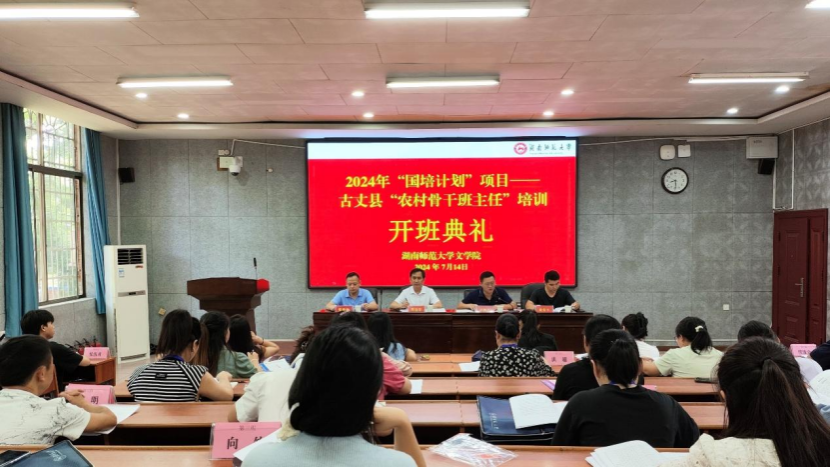 7月14日上午,2024年“国培计划”古丈县“农村骨干班主任”培训班在文学院217教室举行开班仪式。湖南师范大学文学院副院长周凯兴、古丈县教育和体育局副局长覃建华、组织人事股股长张安平以及来自古丈县的40名班主任学员参加开班仪式。