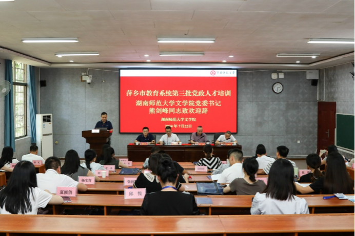 “夏日研修觅智慧,铸就匠心启征程”。7月22日上午,萍乡市教育系统第三批党政人才培训班在文学院217教室举行开班仪式。湖南师范大学文学院党委书记熊剑峰、副院长周凯兴,萍乡市教育局二级调研员叶波、组织人事科科长龙德胜以及来自萍乡市的46名教育系统后备干部参加开班仪式。