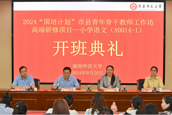 9月20日,由湖南省教育厅主办,湖南师范大学承办的2024年“国培计划”市县青年骨干教师工作坊高端研修项目—小学语文(A0014-1)线下研修培训班如期举行。来自株洲市和张家界市的40名骨干教师参加了本次培训。湖南师范大学文学院副院长周凯兴、副教授周敏,湖南省教育科学研究院小学语文教研员、全国小语会特级教师研究中心委员刘亚雄参加开班典礼。