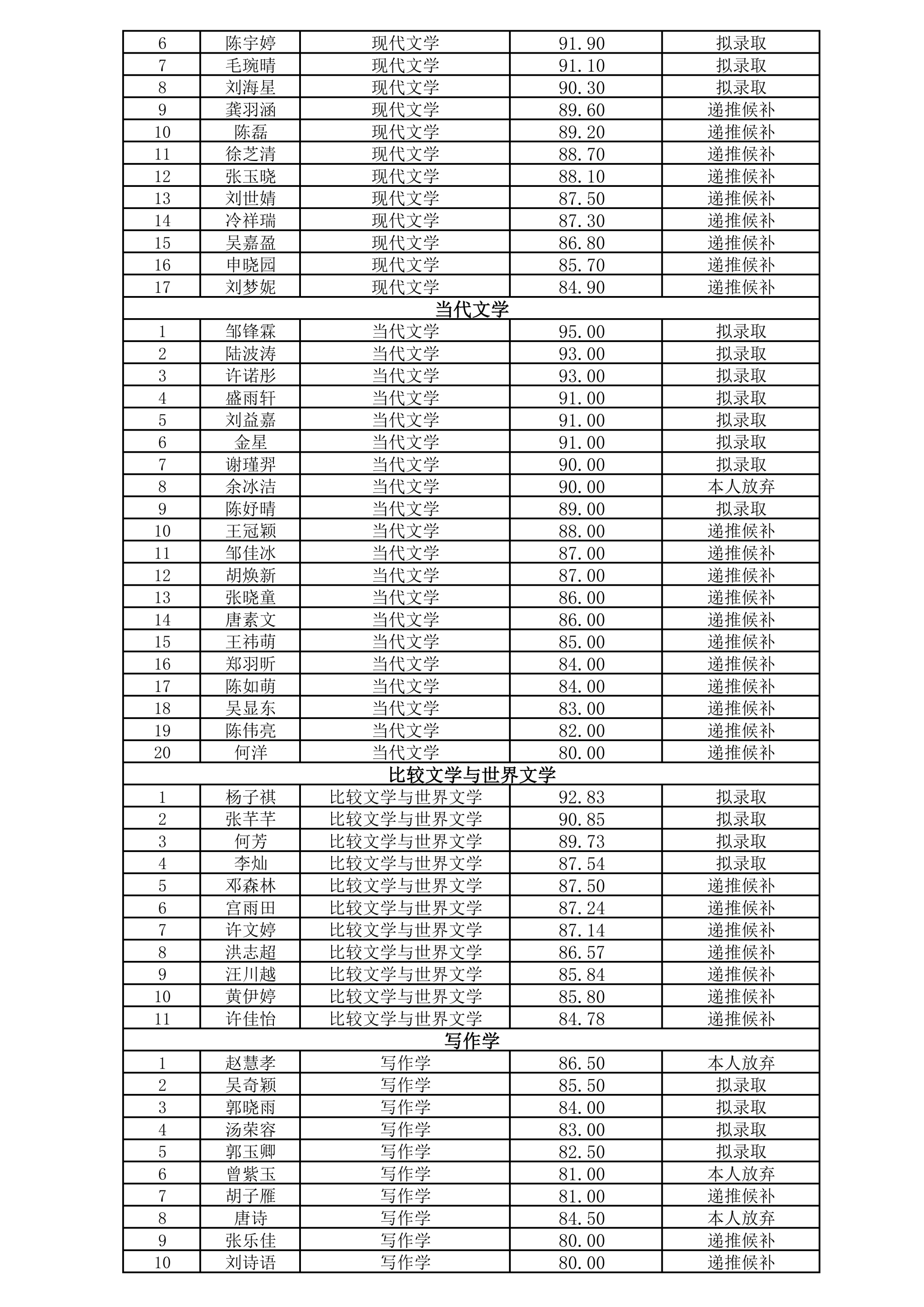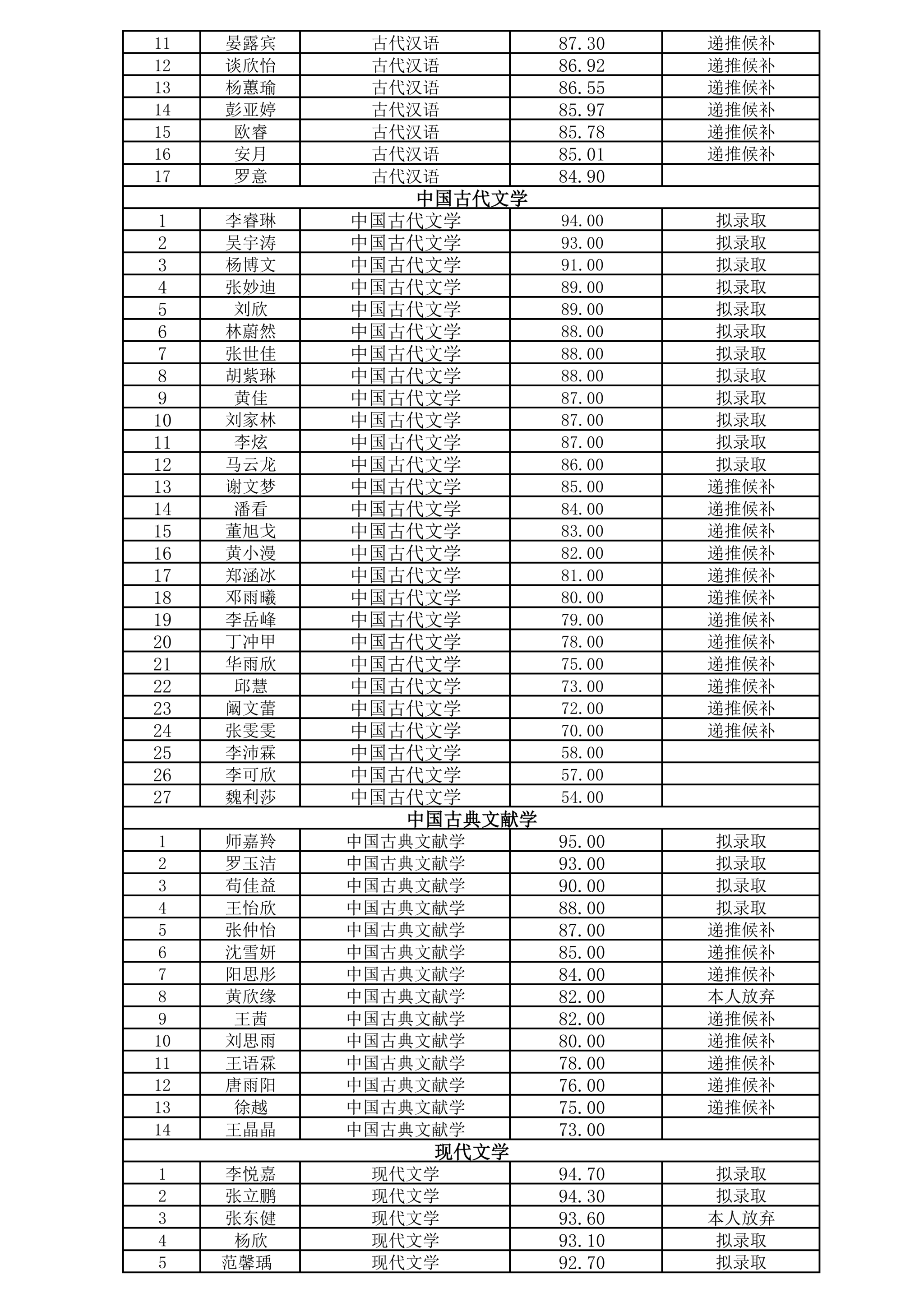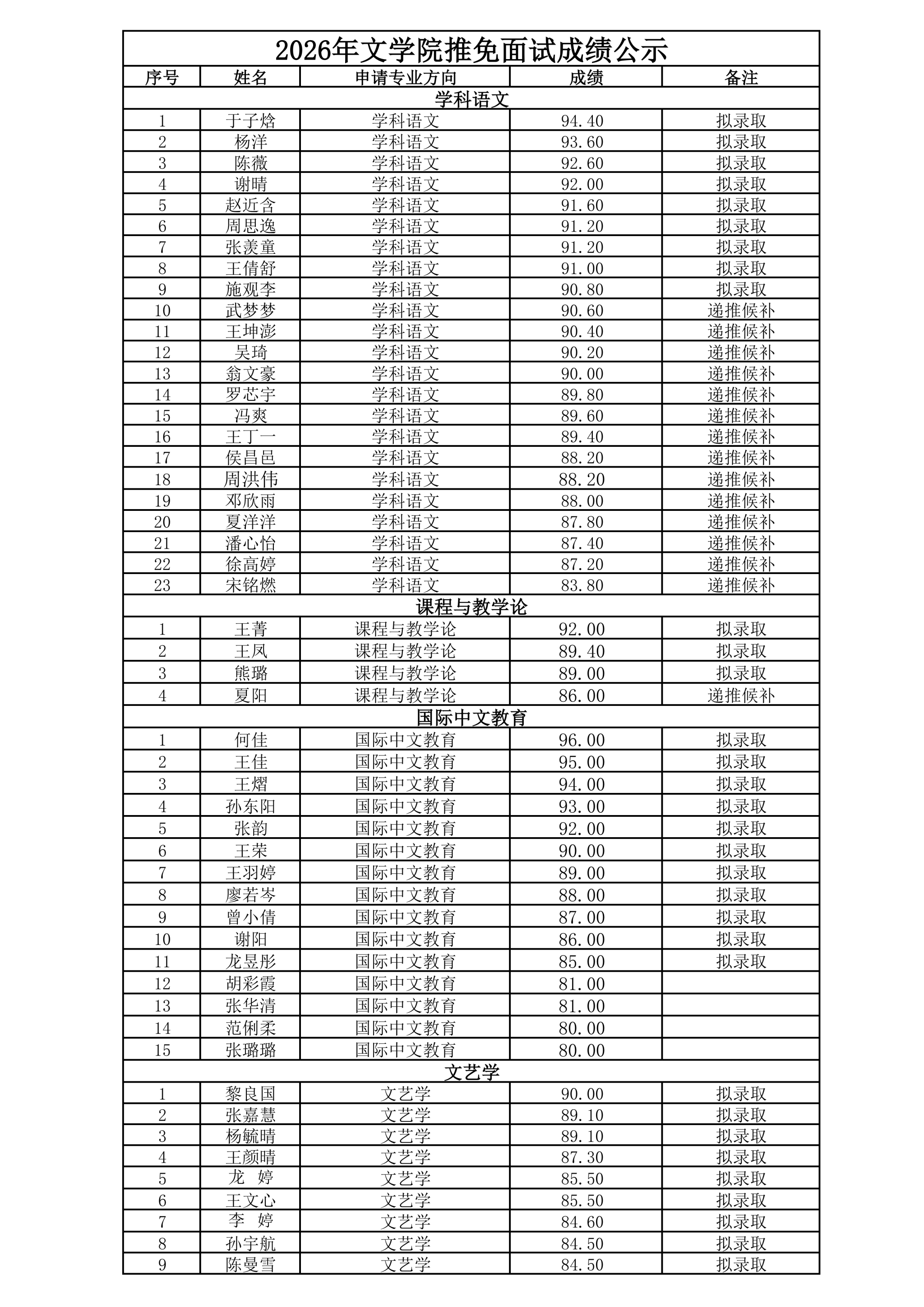 2026年文学院推免面试成绩公示