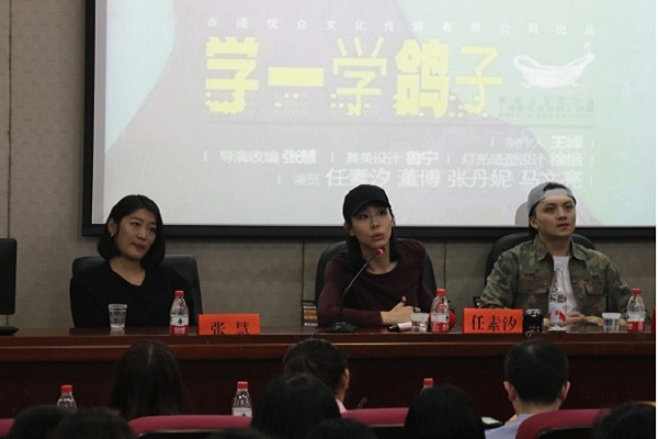 活动伊始,为表示我校师生对剧组各位嘉宾的热烈欢迎,15级戏剧影视文学文学专业马晓璇和朱磊共同演唱任素汐的代表作,电影驴得水主题曲《我要你》。随后,安敏向各位同学介绍了话剧《学一学鸽子》的创作背景和简要内容,并对剧组成员进行了采访。