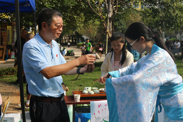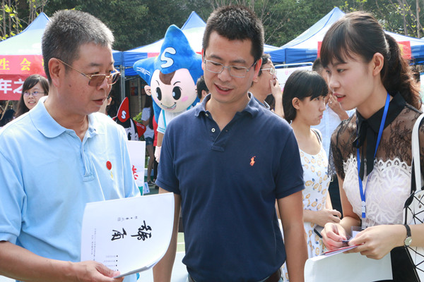 学校领导来到现场视察迎新工作,慰问各单位迎新工作人员,看望新生和家长,并与家长新生一起参与创意迎新活动,观看汉服表演、翻看文学院迎新专刊《号角》、共同品尝鹿鸣茶艺社所沏的毛尖、龙井。