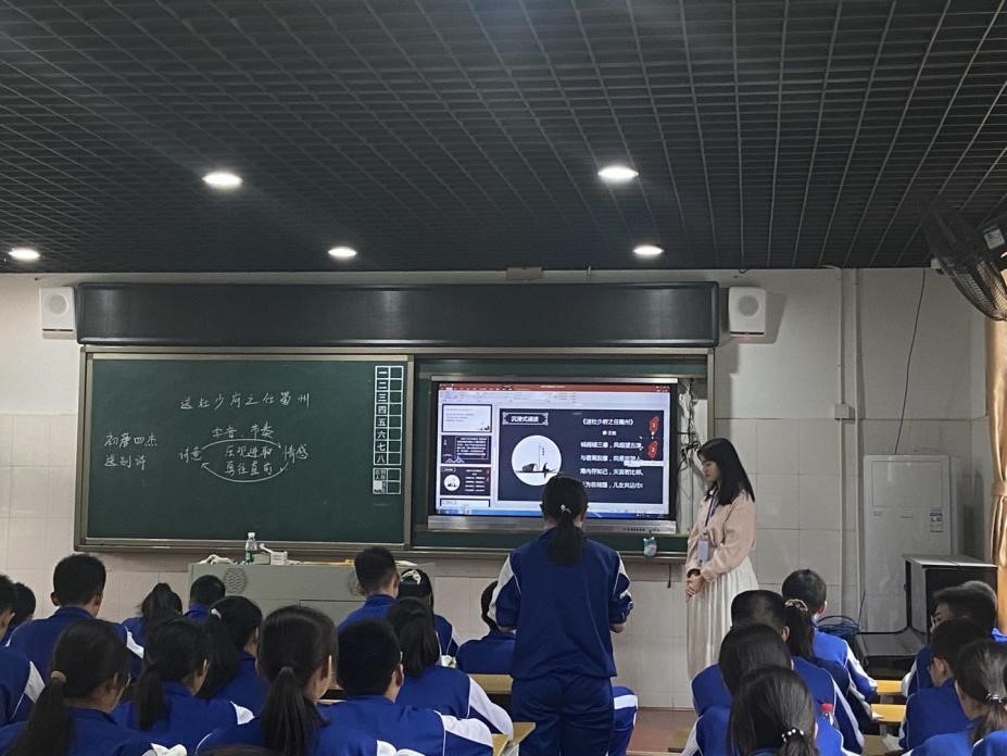 (通讯员 周倩 夏瑞阳 潘梦瑶)5月7日上午,我院赴师大附中博才实验中学(学士校区)实习队开展公开汇报课暨教育实习总结会。此次公开汇报课由实习队周婷与夏诗奇分别于C1909、C1911班展开授课,我院副院长岳凯华、中文系副主任刘光成教授、实习队指导老师郑朋以及师大附中博才实验中学副校长兼学士校区执行校长黄赛、校办副主任袁桂梅、课程与教学处副主任尹文珊、学生发展处副主任袁春茂、教研组组长胡亦优、九年级备课组组长谢松等校方领导出席,博才实验中学部分语文教师及全体实习队员参加。