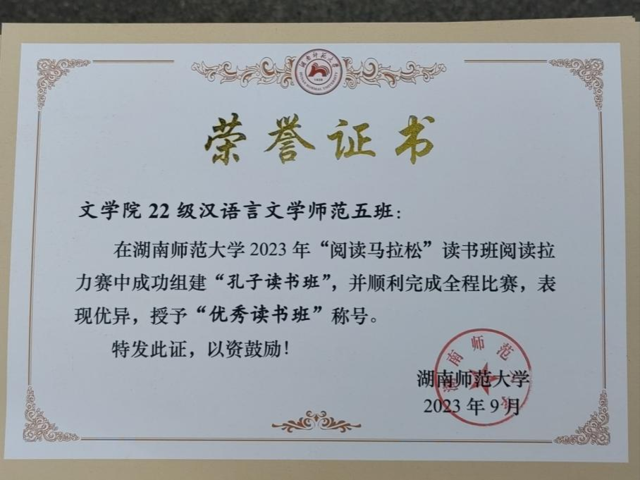 (通讯员王珂萱)2023年4月,湖南师范大学2023年阅读马拉松活动拉开帷幕,来自文学院2022级汉语言文学(师范)5班的15名同学,在班导师易瑛老师的带领下,组成了“孔子读书班”,历经三月,顺利完成全部站点阅读任务,并通过最终答辩环节,取得了全校第一名的好成绩,荣获“优秀读书班”称号。班级首席阅读官、文学院易瑛老师荣获“优秀首席阅读官”称号,班级领读者王珂萱同学荣获“优秀领读者”称号。