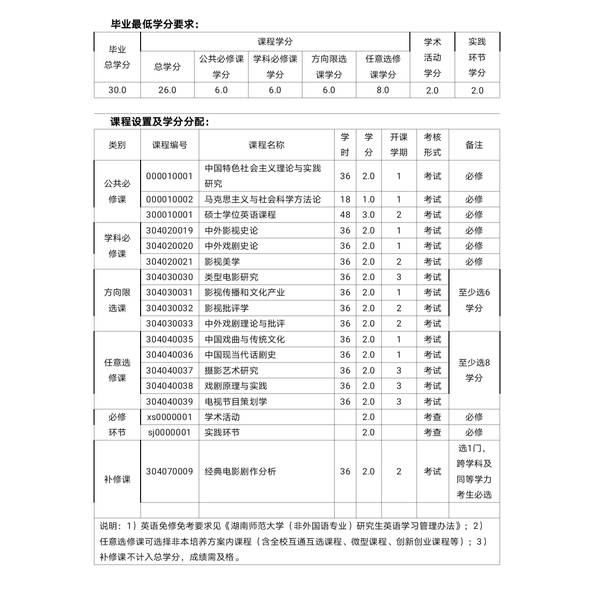 湖南师范大学学术型硕士研究生培养方案(2017年版)学科名称:戏剧与影视学(学科代码:130300)