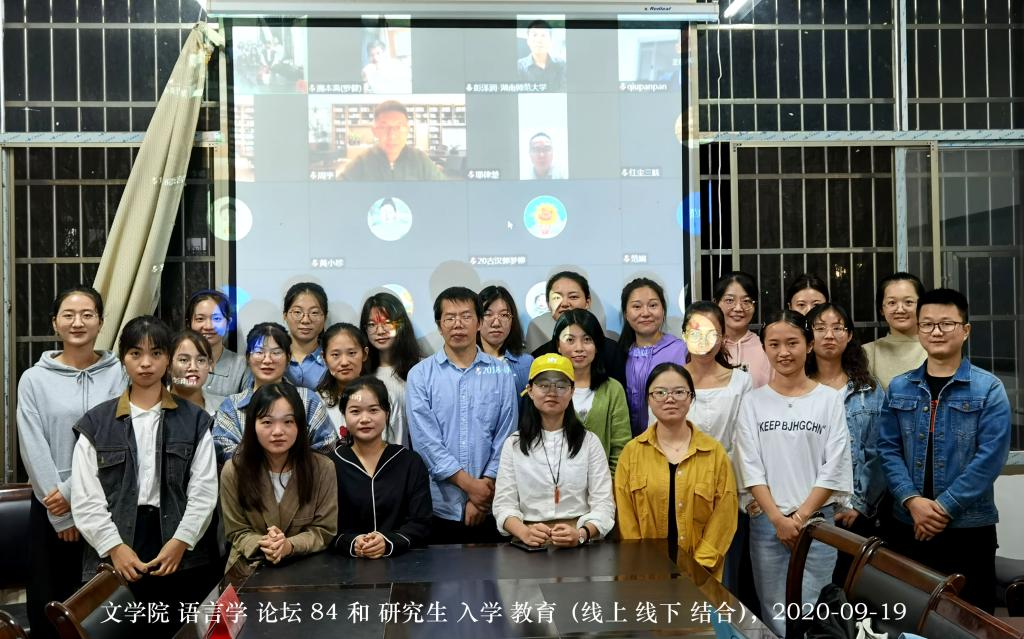 (通讯员熊茁、佘欣慰、孙玲芝)2020年9月18日晚,由文学院研究生会、研究生团委主办,2020年级语言学及应用语言学专业、现代汉字书法专业研究生承办的第84期语言学论坛和入学教育,通过“线上+线下”同步的方式成功举行。这次论坛的主题是“研究生的现在和未来”,主讲人是上海师范大学博士生久西杰、湖南中医药研究院新入职的邓湘琴硕士和毕业的优秀研究生代表彭思恩、邱盼盼、周鑫琳、周宇、杨叶青等。杨合林、彭泽润、罗健3位教授线上参加,贺福凌副教授在线下参加。粟碧琴硕士生主持。