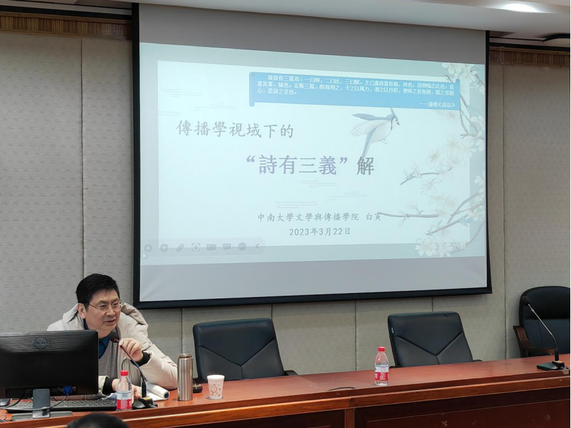 (通讯员 娄上)3月22日下午15:30,中南大学文学与新闻传播学院教授、博士生导师白寅做客文学院“智慧之光”系列讲座,进行题为“传播学视角下的‘诗有三义’解”的学术讲座。本次讲座由文学院副院长吕双伟教授主持,部分文学院师生到场聆听。