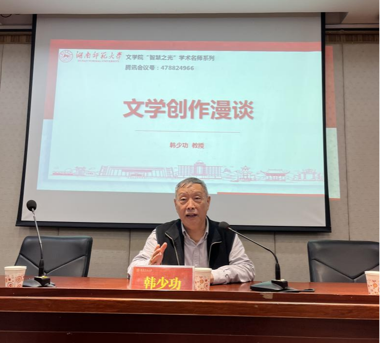 (通讯员刘库 陈尚)10月15日晚,著名作家、湖南师范大学文学院77级校友韩少功应邀在文学院报告厅开展了题为“文学创作漫谈”的讲座。本次讲座由文学院党委副书记刘宓蜜主持,文学院副院长岳凯华、副院长周凯兴,曾小明、刘库、吕不等多位专业老师和百余位本科生、研究生共同参与。北京师范大学纪录片中心主任张同道教授率领纪录片《文学的故乡》拍摄组参与了本次讲座。