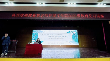(通讯员黄迎迎 王金国 陈晓岚)3月6日下午,文学院2022级汉语言文学(师范)专业教育见习讲座于江边活动中心举办。谭嘉慧应邀作讲座,中文系副主任刘光成主持,2022级汉语言文学(师范)专业全体学生参加此次会议。谭嘉慧是长沙市怡海中学语文名师工作室首席名师、湖南省“教学能手”、长沙市“卓越教师”、长沙市天心区教育领军人才、清华大学出版社签约作者。谭嘉慧用智慧和汗水浇灌了教育的沃土,让一朵朵智慧之花在各领域绚丽绽放。