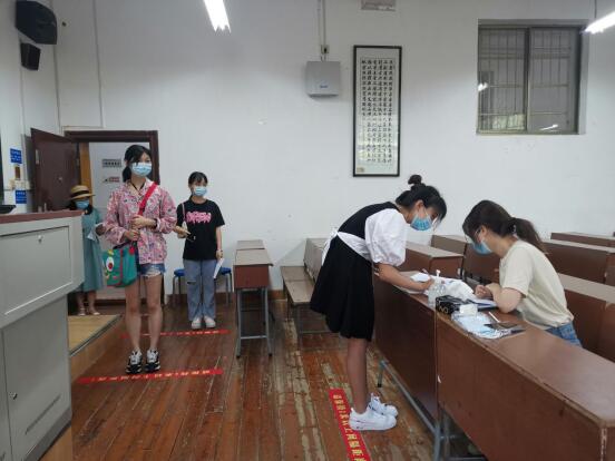从上午8:00开始,阔别文学院九个月的学生陆陆续续前来报到。记者看到,报到现场井然有序,返校学生严格按照流程办理返校手续。除要出示湖南居民健康卡(“绿码”)外,还必须出示由本人和家长签字的14天体温健康表,并登记个人信息。