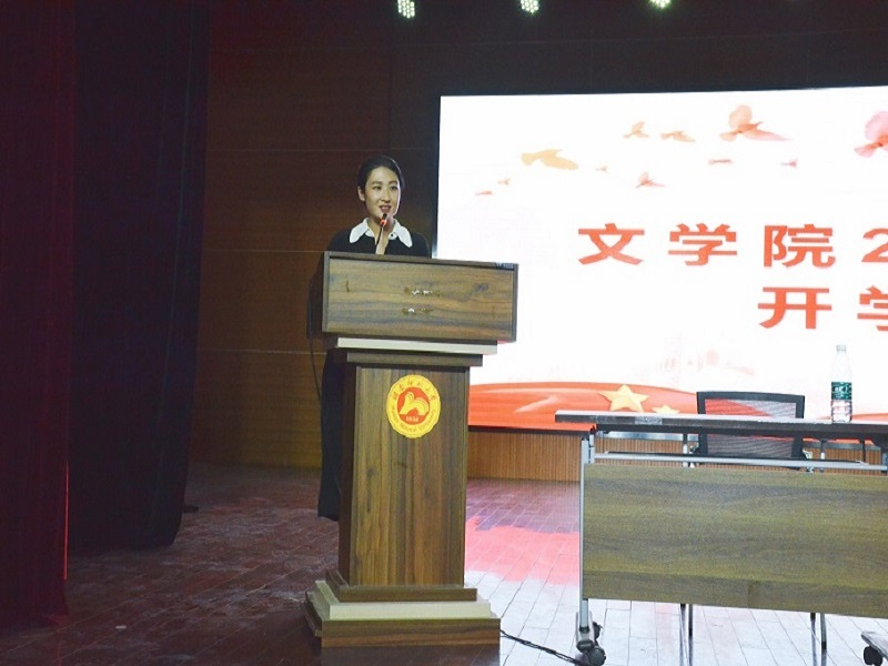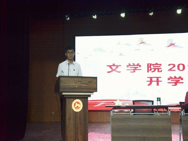 本科生老生代表2015级学生李坤霖发言,他用自己的亲身经历激励新生,要勇于抓住机遇,敢于行动,善于选择规划,同时还要亲近师长、结交同学,砥砺相长,做一个优秀文院学子。