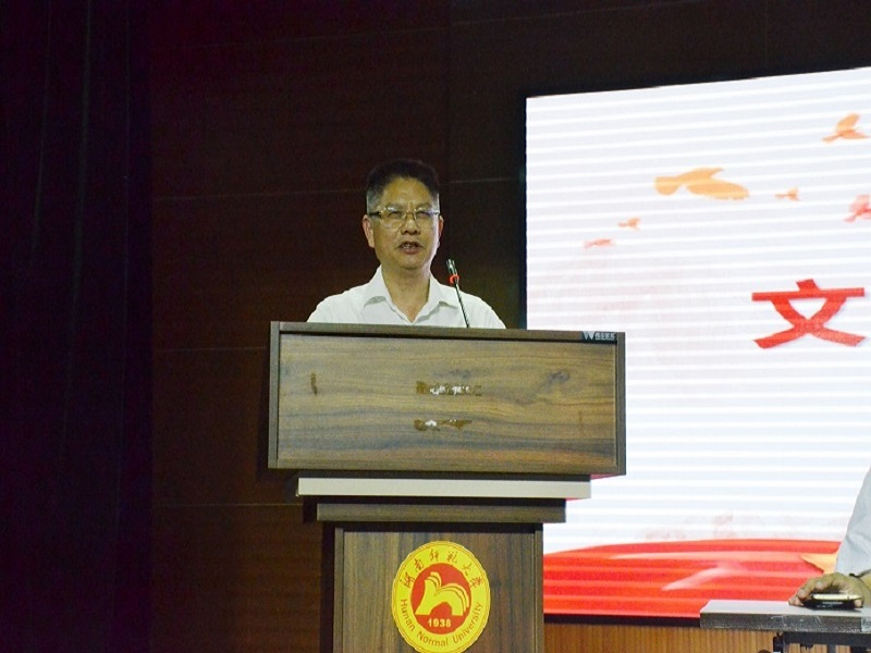 在唱完庄严肃穆的国歌之后,唐贤清教授向新生致辞。他向新生介绍我院源远流长的历史和底蕴深厚的湖湘文化,他表示大学是人生重要转折点,并建议新生在大学阶段完成三段修行,一是智慧的修行,二是品行的修行,三是服务社会。