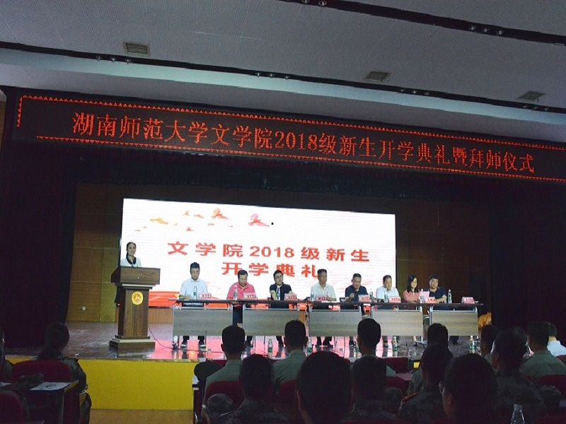 典礼最后,拜师仪式开始。此次拜师礼邀请我院教授何林军、李红叶作为受礼教师。在主持拜师礼的学生指导下,18级新生全体起立向老师行礼,共同诵读《大学》节选篇章。作为文学院的开学传统,拜师礼意在向新生传递“尊师重道”的理念。